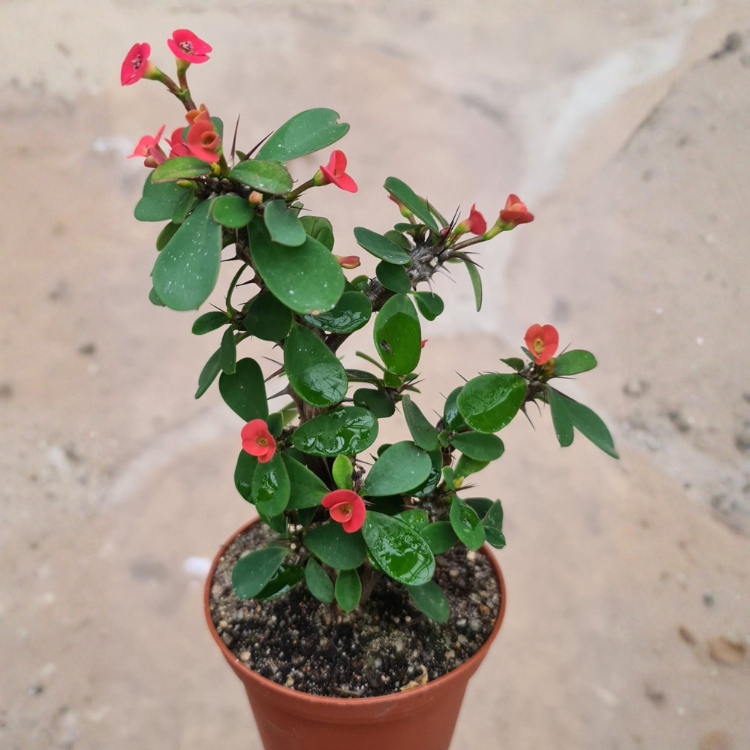 একটি সুস্থ ও ফুলসহ সতেজ ইউফোরবিয়া মিলি গাছ।